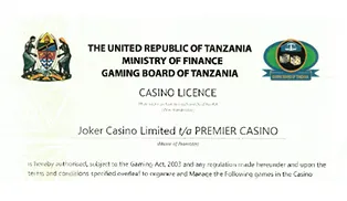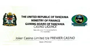 Official casino license issued by the Gaming Board of Tanzania, authorizing Joker Casino Limited (Premier Casino) to legally operate and manage casino gaming activities in Arusha, Tanzania, during the licensed period.
